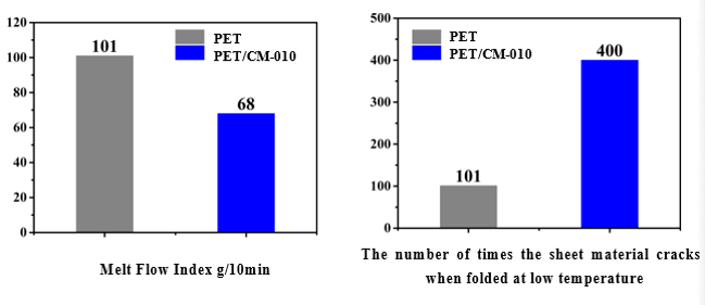 The PET/CM-010 blend significantly improves low-temperature flexibility, crack resistance, and processing stability, making it ideal for durable applications in extreme cold conditions.